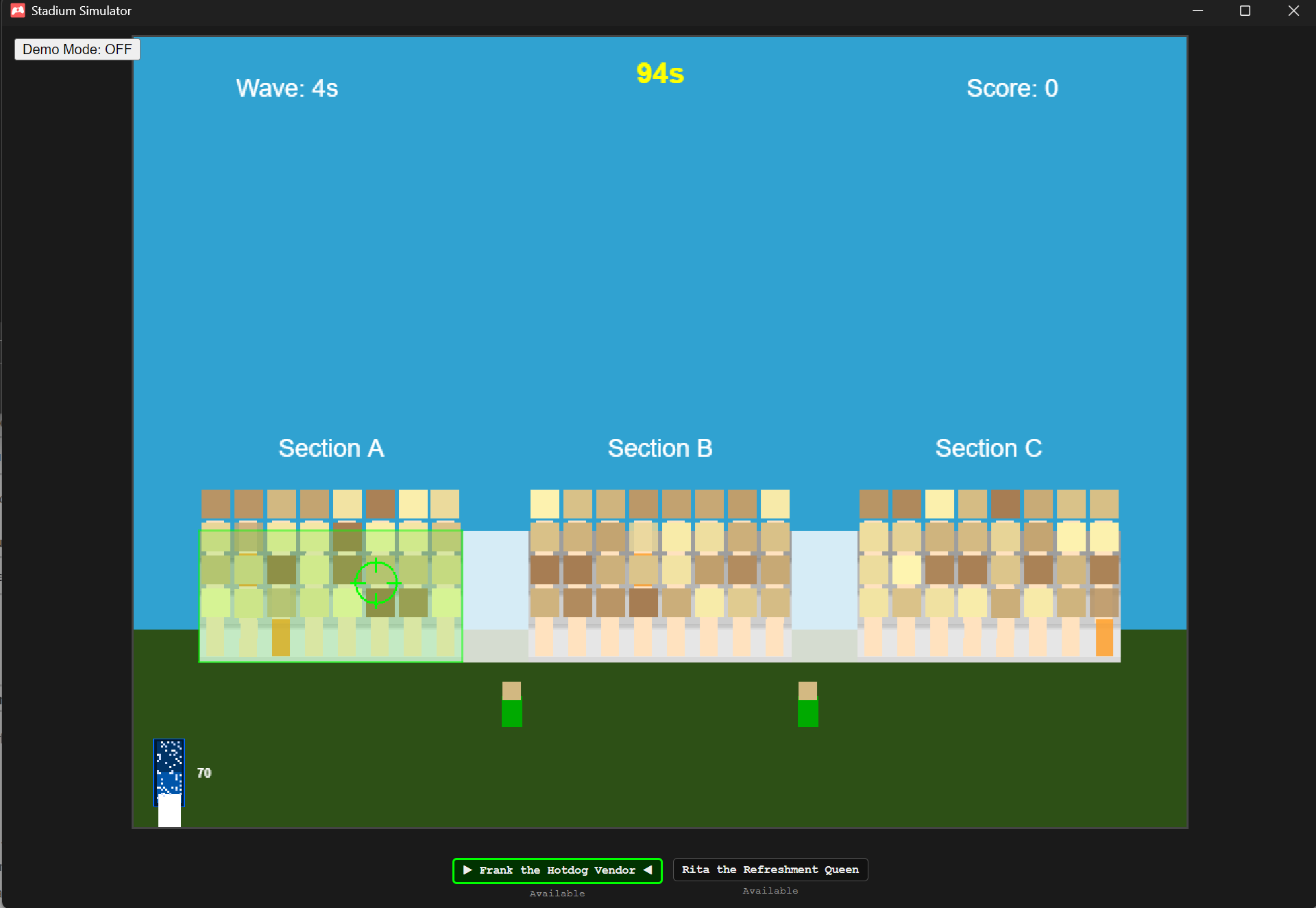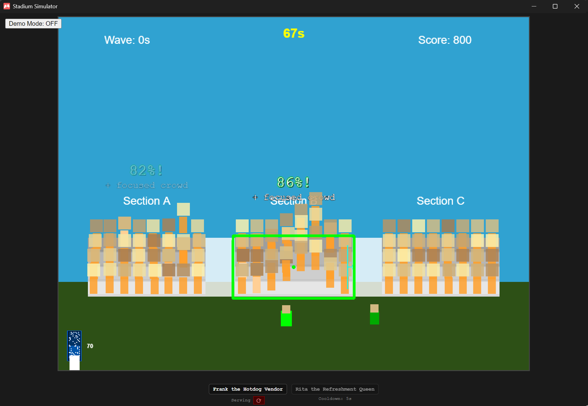 A retro arcade stadium wave simulation game! Strategically manage crowd sections, vendors, and mascots to create the perfect wave.
